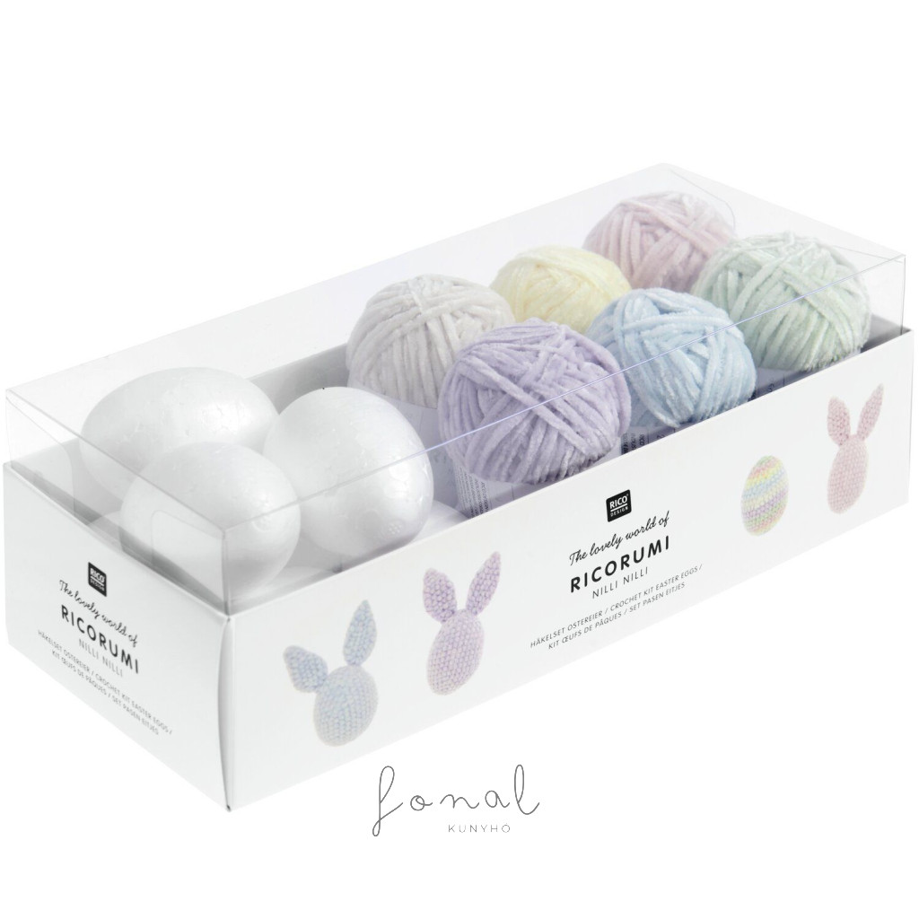 - Horgolt húsvéti tojások - Tartalom: részletes útmutató, 7 db hungarocell tojás, 6 db Ricorumi Nilli Nilli fonal pasztell árnyalatokban