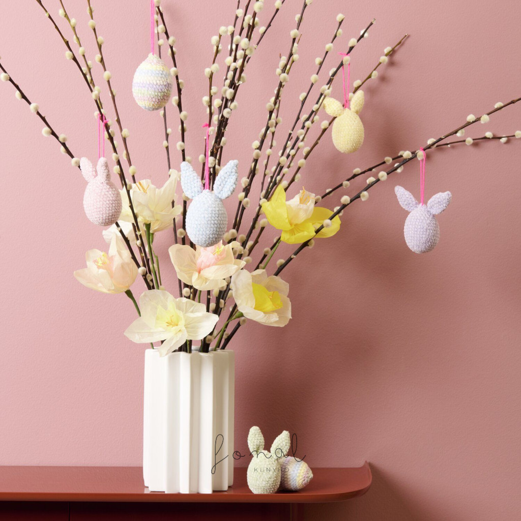 Horgolás után a tojások díszesen elrendezhetők egy fészekben, vagy cérnával felakaszthatók egy húsvéti ágra.